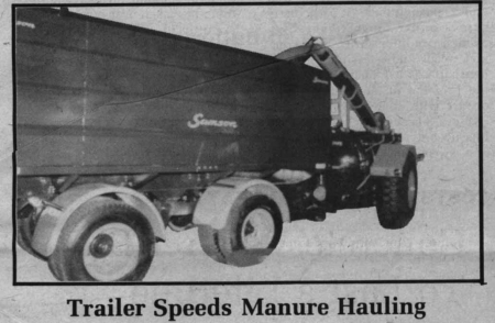 The Samson Company's water-tight slurry trailer -- towed behind the slurry tank to the spreading site -- has twice the capacity of the tank. The operator, without leaving the seat of the tractor, pumps and loads three times as much manure on each trip to the field as he formerly handled without the tag-along trailer.