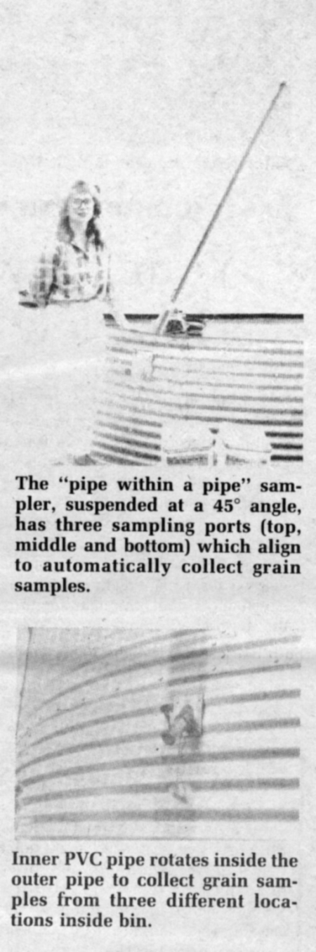 The "pipe within a pipe" sampler, made of pvc, is installed at a 45 degree angle inside the bin. It's 13 ft. long and has three "grain inlet" sampling ports at the top, middle and bottom. You simply go to the discharge end of the sampler, located outside the bin about 6 ft. off the ground in a 5,000 bu. bin. Turning the sampler's inside pipe (2 in. dia.) to the 3 o'clock position aligns its top opening with 2 in. dia. outside pipe's top opening, allowing grain to flow into the matched slot openings, down the inside tube and into the sampling container. You sample from the middle port by turning the inside pipe to the 6 o'clock position, and from the bottom opening by turning it to the 9 o'clock position. To close off the sampler completely, you turn the inside pipe to the 12 o'clock position.