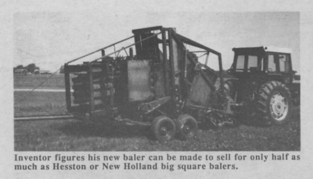 "The big advantage is that unlike conventional plunger-type big square balers that compress the entire bale at once, you're only compressing a small amount of hay at once. As a result the machine requires 30 to 40% less horsepower, weighs 30 to 40% less, and there are less complicated mechanisms to go wrong," says Siebenga, who figures the machine will cost only half as much as other big square balers while producing bales of the same density at the same or an increased rate.