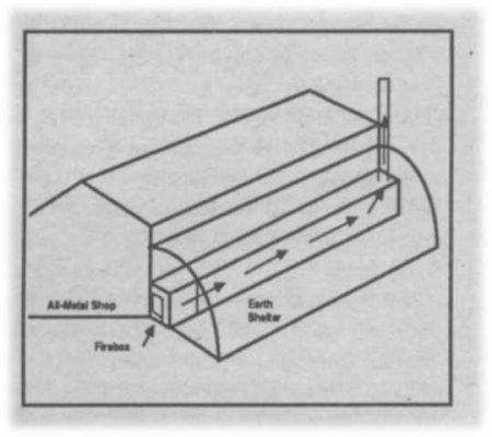 At one end of the chamber, a "revamped" 200 gal. fuel oil tank serves as a 2 by 4 ft. firebox. It's equipped with a 10 by 30 in. vertical hinged door through which Twite can roll whole car tires directly into the firebox. At the opposite end of the 16 ft. long chamber is a 1 ft. dia. round metal chimney. The entire chamber is covered by a huge mound of earth which pushes up against the building's entire north wall.