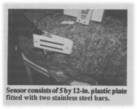 Black says the moisture reading is updated every 4 sec. and rounded off to whole numbers (from 10 to 36%). "Although the monitor is taking continuous readings and averaging them, the operator just looks at the one number, which changes slowly enough to make it easy to read," he says, noting that it took a lot of experimentation to find the correct design for the sensor.