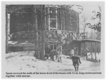 The outside walls are covered with two layers of 1-in. thick insulating "bead" board. The lower level of the house is also covered with a layer of 12-in. long blocks of cord-wood (dried for two years) held together with mortar.