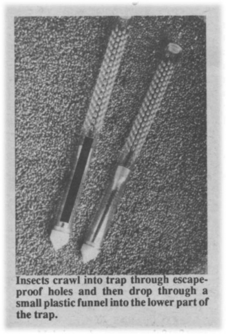 The 1-in. dia. by 15-in. long clear probe is made of unbreakable plastic. Insects fall or crawl into the trap through escape-proof holes and then drop through a small plastic funnel into the lower part of the trap. The trap is buried 3 to 6 in. down into grain near the top of the bin. Mohring says that's where you'll find the highest concentration of insects since they "migrate" toward the top where there's more air.