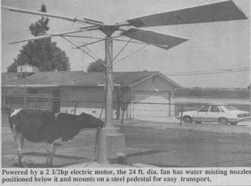 The University of California extension researcher has designed a barnyard version of overhead paddle fans used in homes and offices. His fan is 24 ft. in dia. from blade tip to blade tip and has water misting nozzles positioned below it.