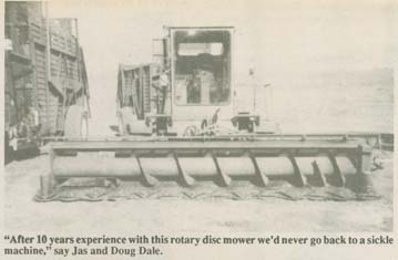 The machine is actually a highly modified Lowe mower which they bought in 1980 from Terry Lowe, Oak Harbor, Ohio, who built about 38 of the rigs before going out of business (the Dales, who commercially produce and harvest alfalfa hay, bought three of the mowers). Lowe's mowers were originally equipped with two Vicon 6-rotary disc cutterbars laid end to end. Some were center dump heads and some were end dump heads. The Dales decided to design their own head, finding that the Lowe-built head was too flimsy and wouldn't cut right.