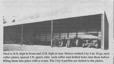 "I built it because I needed a bigger machine shed. The door openings on my old shed were so narrow that I had to drive my 6-row combine within inches of the door-way posts in order to fit the combine into the shed. The 24 ft. openings between posts on my new shed leave plenty of room for my combine, and the 14 ft. 1 in. of vertical clearance lets me drive in without having to fold down the combine's extension hopper," says Heinze.