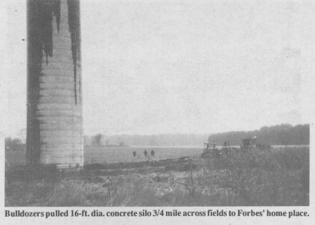 Forbes used three bulldozers to tow the 60-ft. high, 16-ft. dia. steel-reinforced poured concrete silo on a steel "sled" across corn stalks, wheat stubble, a newly planted wheat field, and a pasture.