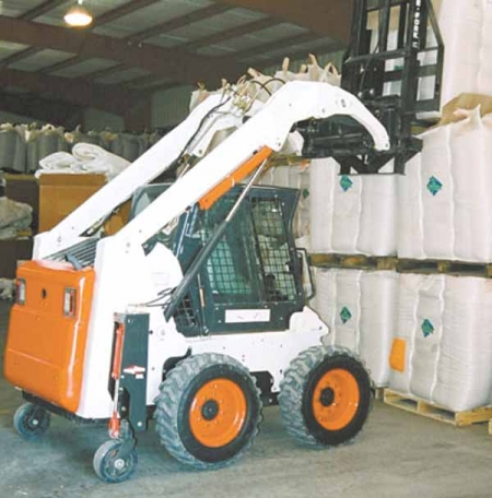 When you're carrying a heavy load on pallet forks with your skid loader and turn on a hard surface such as pavement or concrete, the machine's rear wheels can start bouncing, causing the load to drop off or leaving big skid marks. This new skid steer caster wheel kit adds stability that eliminates such bouncing.
