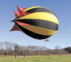 The pilot controls direction, elevation and speed with a simple joystick control panel from a pod suspended beneath the blimp. Nachbar says the blimp can hover steadily in place, travel against the wind, and go virtually anywhere he wants to go.