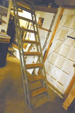 “The only tricky part was positioning the cables and the weights to match the weight of the ladder,” says Tierney. In the “up” position, the ladder is flat against the ceiling.