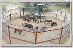 The Wireless Trap system can capture one hog or several members of a family group. The company recommends a 6-ft. tall by 30-ft. dia. modular steel gate enclosure for the trap. Panels are pinned together and the headgate opening is equipped with an electronic latch. An automatic feeder is placed inside to entice animals to enter. A motion-activated remote camera is installed at the center of the trap to photograph animals when they enter and send the image to the owner. The camera can also be triggered randomly from a cell phone or a computer.