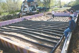 “We laid one layer of heat tubes over the insulation with tubes on 16-in. centers,” says Staus. “They were covered with a foot of sand followed by a second layer of heat tubes perpendicular to the first. They were covered with about 6 in. of sand.”