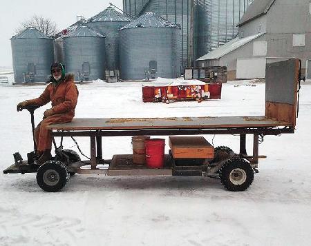 "We use it all year long for a variety of jobs. It's really handy," says Butler, who credits his helper Richard Donnelly for most of the planning work. "We use it to feed bales to sheep and to horses that we board on our farm, and also to weigh big plastic tote bags of organically grown seed that we sell locally. The electric motor has a lot more torque than a gas motor so it has no trouble handling an 800-lb. bale. A big bale provides a lot of traction, so it'll go through deeper snow than you'd expect."
