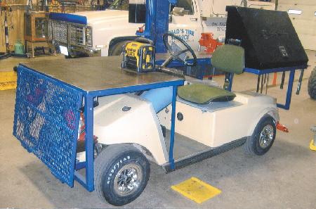 He recently sent FARM SHOW photos of his modified electric golf cart that carries all kinds of different tools and supplies. The cart is fitted with a big metal frame that wraps around 3 sides of the vehicle and attaches to it with 4 bolts on front and back.