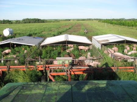 His pigs get fresh pasture twice a day, shade, and a shower when it was hot, and plenty of feed and water on demand. His mobile hog shelters slide through the grass with ease and make U-turns just as smoothly. Everything is geared to having happy hogs.