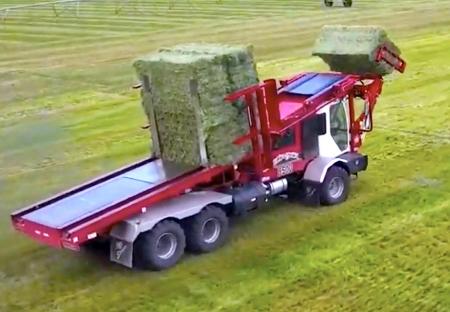 The early bale haulers were designed to be mounted on any medium or heavy-duty truck frame, including used trash trucks or schoolbus chassis. What hasn't changed is the basic design with arms that grab bales ahead of the unit, lift them over the cab, and deposit them on back. Unloading is done off the back end of the unit, stacking up to 14 bales at a time in 2 layers of 7 each.