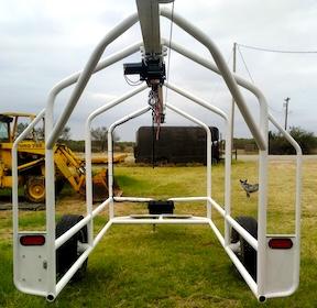 The hoist winch trolley is constructed from 1/2-in. plate steel with 1 3/4-in. dia. cam rollers. The trailer features a sturdy tongue hitch and rides on a pair of wheels from an old wagon. Surber says the gantry works well for safely lifting and hauling LP tanks and totes of different sizes with sturdy metal frames.