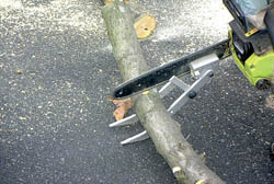 He says it's not meant for cutting branches off trees, because the swing arms would get in the way. "I leave the attachment on one of my chain saws all the time just for cutting felled logs. I use another saw to cut trees down and to trim off the limbs. However, it takes only a minute or so to put it on so you don't need to have two saws."