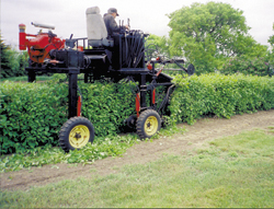 The hydraulic-operated, 2-WD machine straddles a hedge and is equipped with three sicklebar sections that let him trim the sides and top all in one pass. A 42-in. wide length of draper canvas off a Versatile swather delivers top trimmings to the side and onto the ground. The rig's four legs are each equipped with a hydraulic cylinder, allowing the entire machine to be raised or lowered up to 9 in. Another pair of cylinders can be used to independently raise or lower the sicklebars 9 in. If he's working on hillsides, he can hydraulically raise just one side of the machine, or just one side of the sicklebar unit.