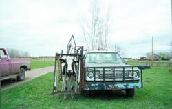 Using 1-in. sq. steel tubing, they built two 7-ft. long seven-bar panels. They mounted one of these on the passenger side of a Dodge 1/2-ton 4-WD flatbed pickup. "We paid for the pickup to use just for this purpose. It has a heavy-duty combination bumper and grill guard on the front, so we bolted the front of the panel to that. The back end of the panel fastens solid to the side of the flatbed," Thompson says.