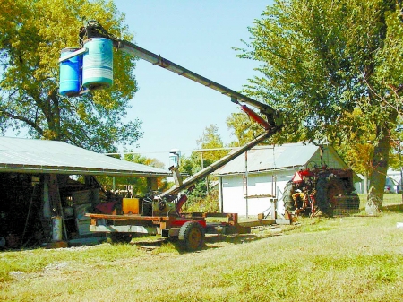 "I needed a way to trim trees on my farm but when I priced a commercial cherry picker, I decided I could build my own for a lot less," says Elmer Pinkerton, Elmwood, Neb. "My home-built cherry picker goes up 40 ft. and swivels 45 degrees right or left. Four extension legs with jacks extend down for stability when working in the swivel positions. "The machine is made from 6-in. square tubing (all 1/4 and 3/8-in. thick), all welded together. Pins are 2-in. cold rolled machine steel. Cylinders are 5-in. dia. for two-way power and to be sure lift speed is slow. "Power is supplied by an 8-hp. gas engine with a 5-gal. hydraulic pump and a 20-gal. tank. The baskets are gravity-balanced with set screws to make them rigid when up. Dual controls are at the top and at the bottom for safety. There are restrictor valves on the boom cylinders to keep the lowering speeds slow. "The rig must be securely attached to a heavy tractor or truck to prevent tip-over. "I don't have any plans or additional information to pass on. I just wanted to share the idea because it works for me."