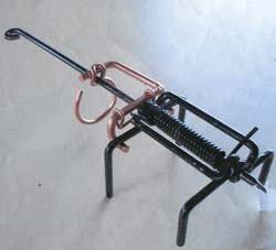 Most gopher traps are set on the bottom of a tunnel, waiting for the gopher to crawl over them to trip the trap. Ken Sprick's trip mechanism hangs from the tunnel roof with trap arms to its sides. A gopher runs through the tunnel and bumps the trip, springing the arms. "I had gophers in a field of alfalfa and set out 18 traps," says Sprick, recalling why he came up with the idea. "When I checked them later, all 18 had been plugged with dirt." Initially Sprick, a retired tool designer and machinist, tried to improve existing traps. He soon decided he needed an all-new design. Sprick's trap looks a bit like a four-legged insect with a long tail. The front legs are slightly shorter than the rear. The main body contains the tensioning spring at one end of a long pin. The four legs are the arms of the trap. They are the only elements of the trap that touch the gopher tunnel floor. The tail of the trap, at the opposite end of the pin from the spring, has a loop for attaching a stake. Setting aids similar to two beer can openers are used to pry open the arms of the trap for setting. Holding them in one hand, a latch mechanism is slid along the pin to hold the arms open. The trip mechanism is then slid in place to secure the latch. "I set it so the trap rests on the longer arms while the shorter pair of arms are raised giving the gopher clear passage underneath the trap," explains Sprick. "A small stake through the loop at the end of the pin holds it in place so the trip hangs free and doesn't touch the dirt." When the gopher crawls between the arms and hits the trip, the arms crush the gopher. Even if a gopher were to push dirt through the trap toward the trip, it would release the arms and trap the gopher. Sprick uses purchased springs, but makes the rest of the trap from 3/16-in. and some 1/8-in. steel rod. He also designed and fabricated the various hydraulic press jigs needed to bend the rod. The entire trap takes 29 steps to make, including one weld. "The trap can also be used to catch rats," explains Sprick. "Set it and slip it inside a piece of pvc pipe with wire mesh attached to the end. Extend the looped end of the pin through the mesh with bait between the trip and the wire mesh." Sprick has sold hundreds of the traps. At 80 years of age, he says he would prefer to license his design rather than manufacture the trap himself. Sprick has modified his design slightly to make an easily moveable bird feeder hanger that quickly attaches to trees or posts. The hanger uses the same spring as the trap, but with the longer arms. "It works great on smaller trees, up to about 10 in. in diameter, " says Sprick. "The hanger extends out about a foot from the tree and swivels."