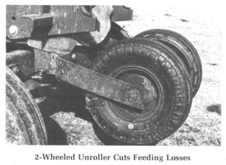 As the tractor is driven forward at 3 to 4 mph, the dual wheels rotate backward against the bale to unroll it smoothly and quickly.