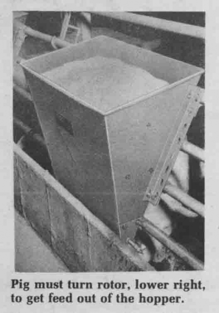 "It's designed to make each pig work the equivalent of one hour a day for his food from weaning to market," explains Henning Hansen, designer of the feeder patterned after similar units which have caught on fast in Denmark and other European countries.